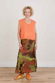 Patterned Satin Slip Skirt Midaxi skirt with abstract design and elasticated waist 100% viscose Karen is a size 8/10 and 5’6″ tall and is wearing size Small / Medium.