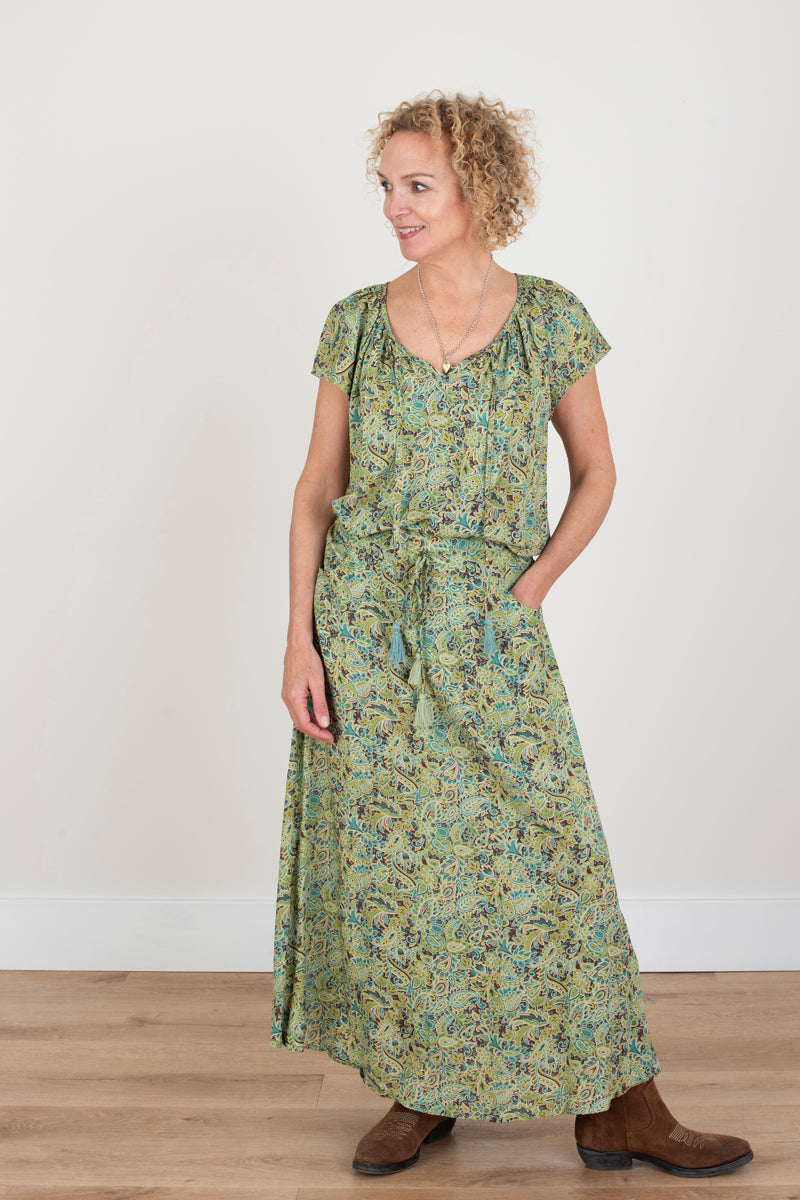 A green print viscose modal short sleeved blouse with capped sleeves and tassel ties  100% viscose modal