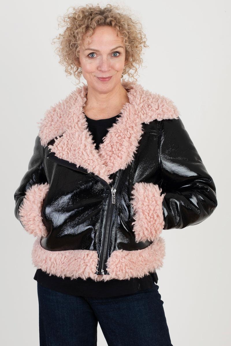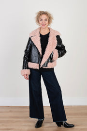 Biba Jacket Statement jacket - black shiny texture with pink faux fur including in lining.  Barely worn