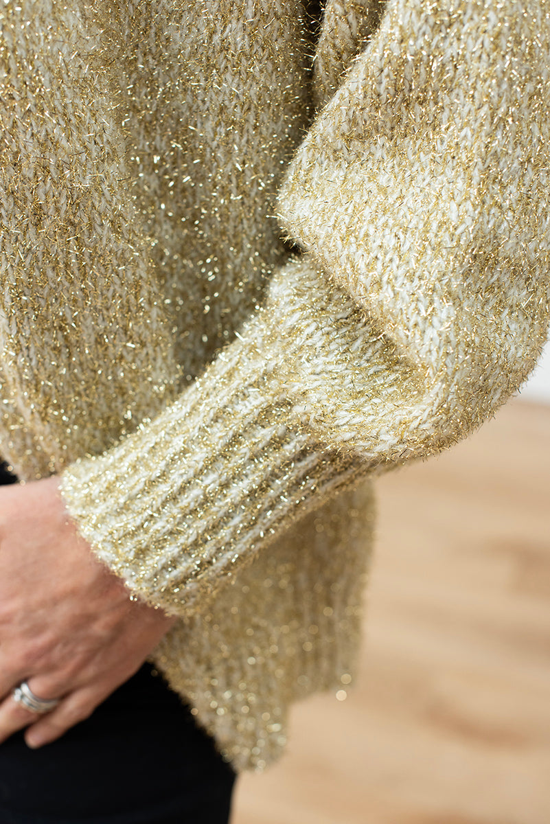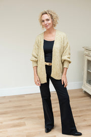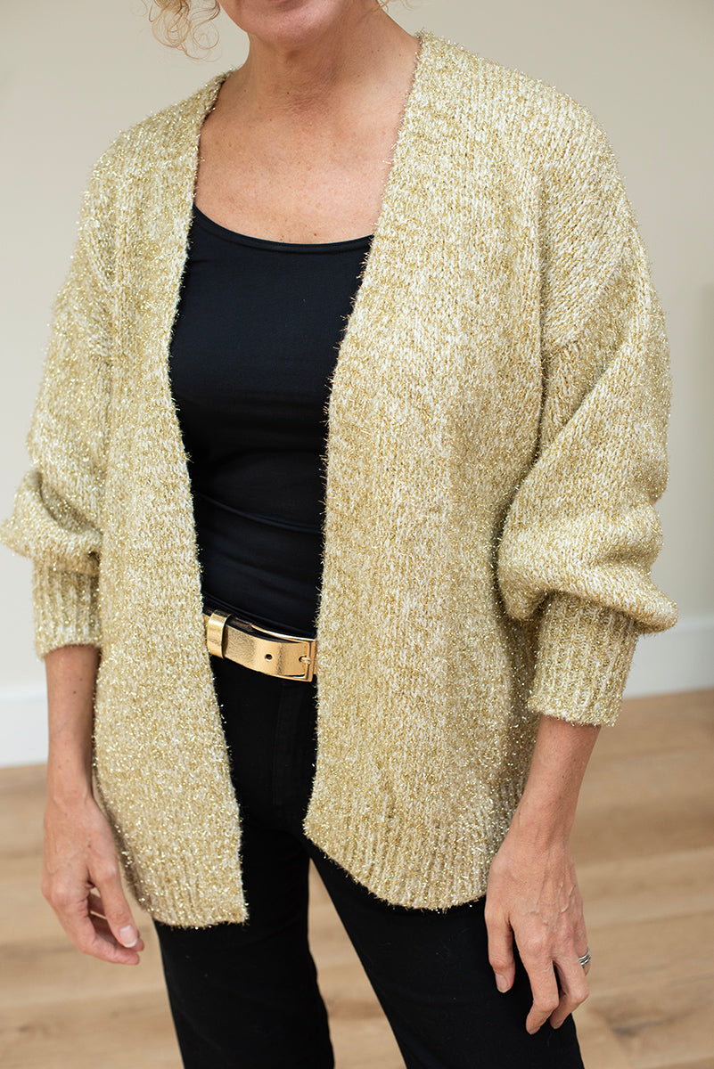 Gold Sparkle Cardigan. 30% acrylic, 30% nylon, 12% wool, 10% viscose. Available in one size