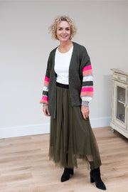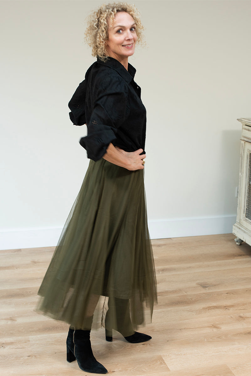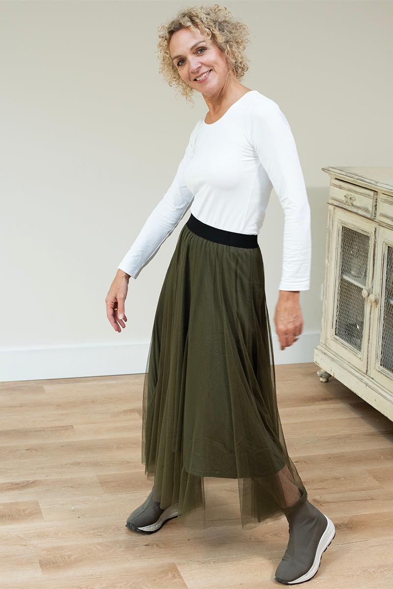 Khaki Tulle Skirt. Lined and an elasticated waist. Polyester and viscose.